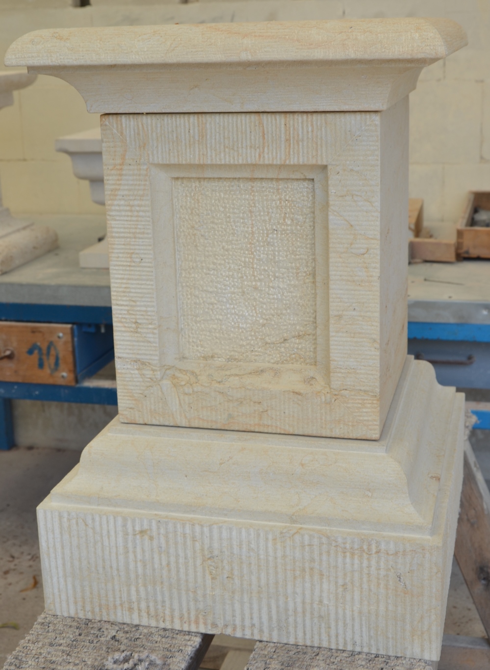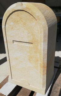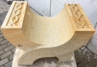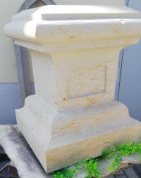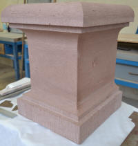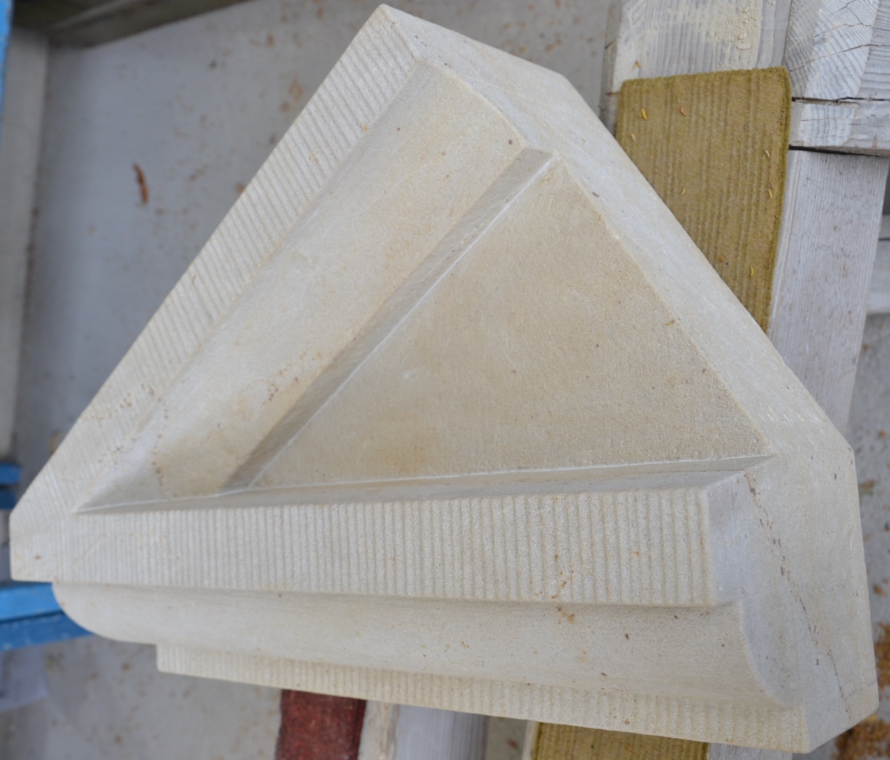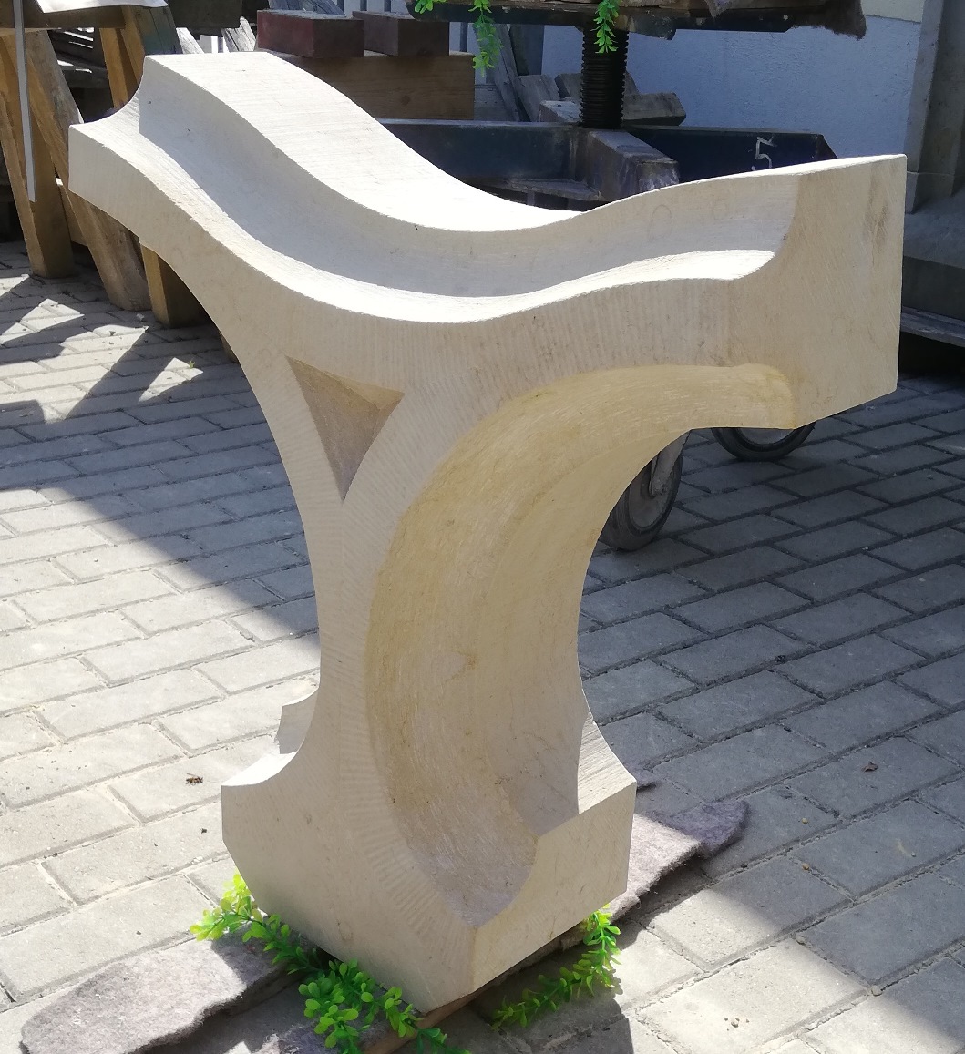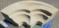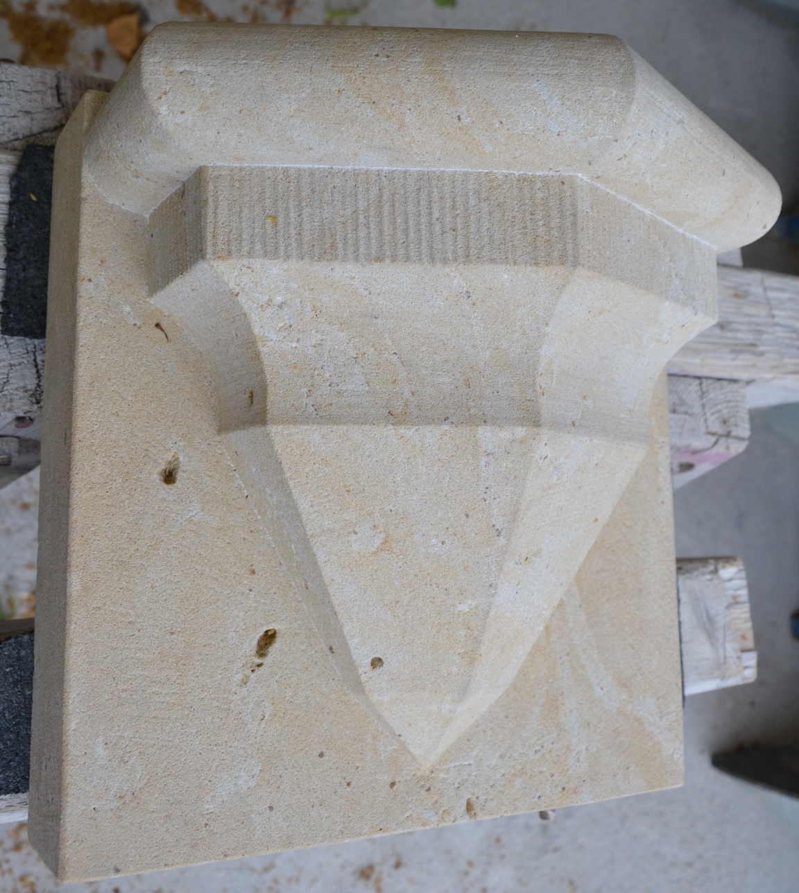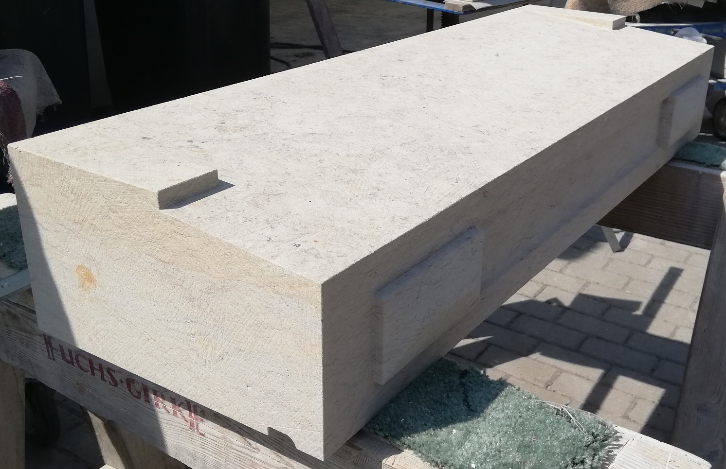 Werkstücke aus vorwiegend Sandstein und eine Arbeitsprobe mit Text und