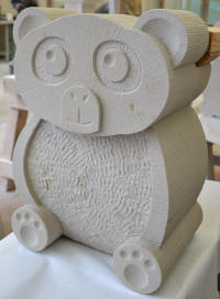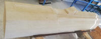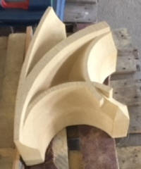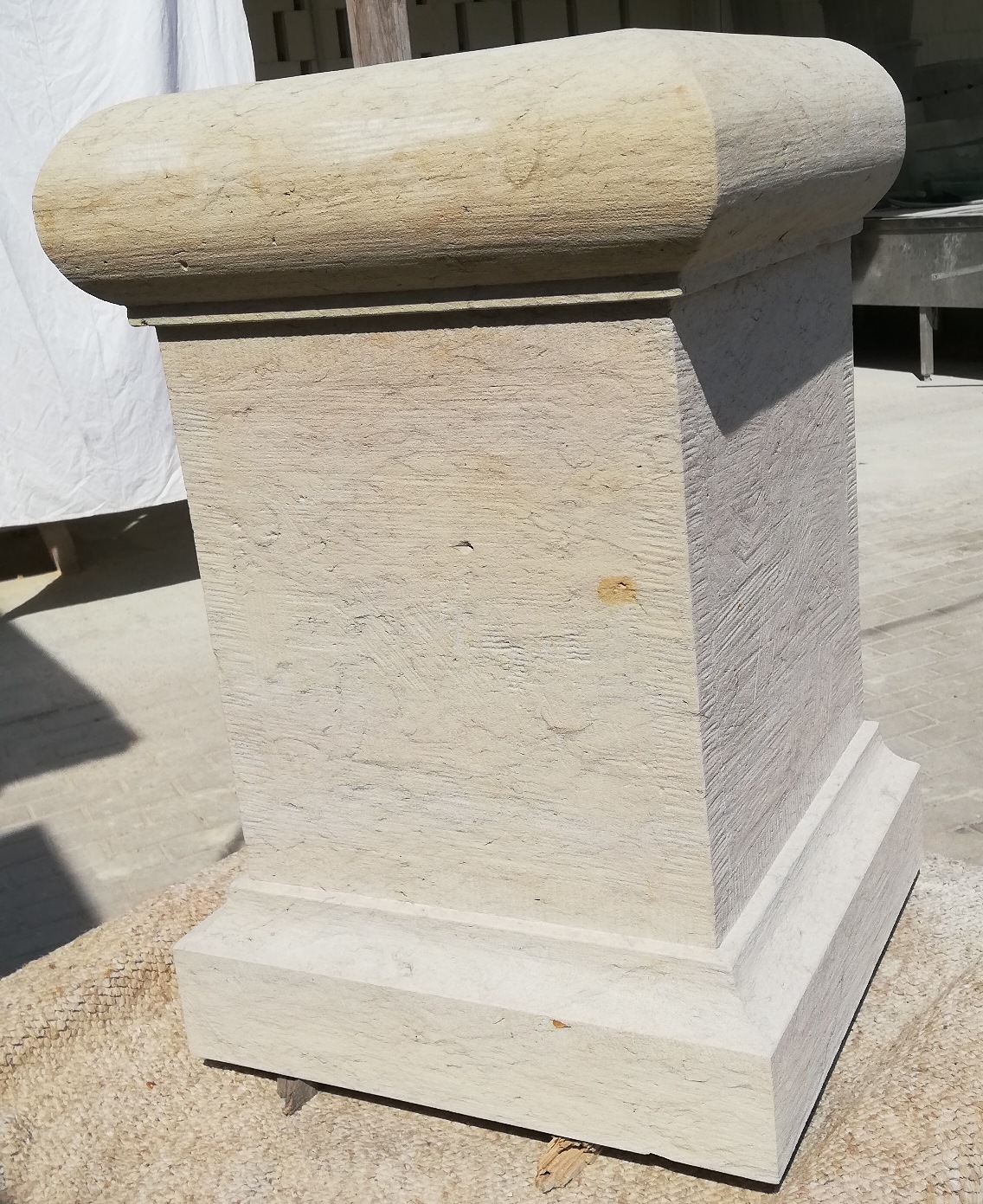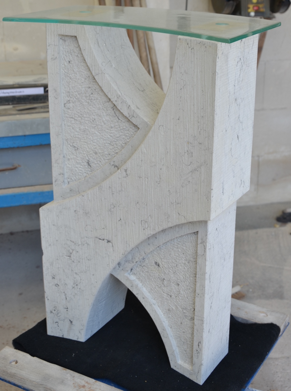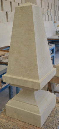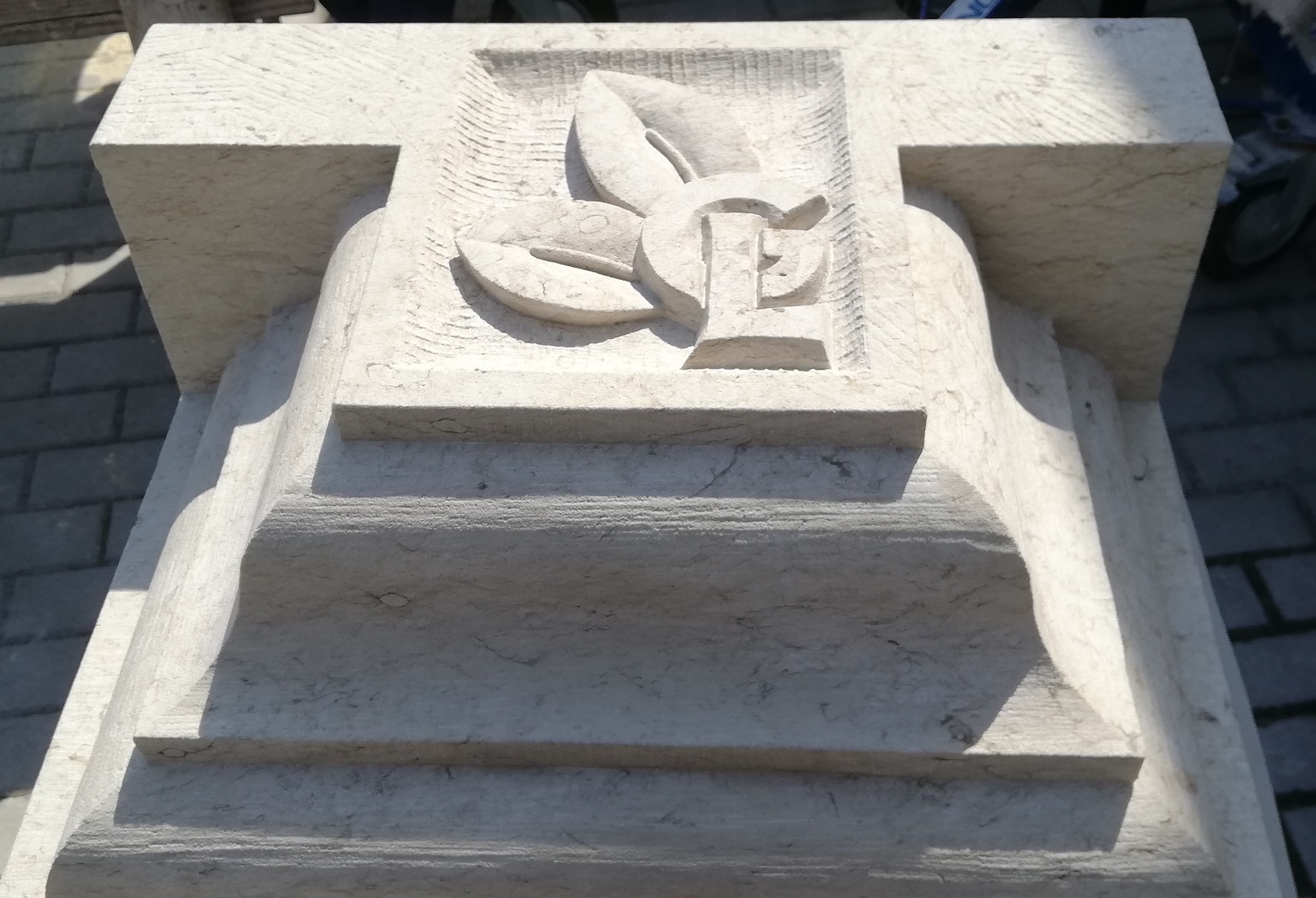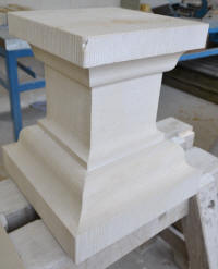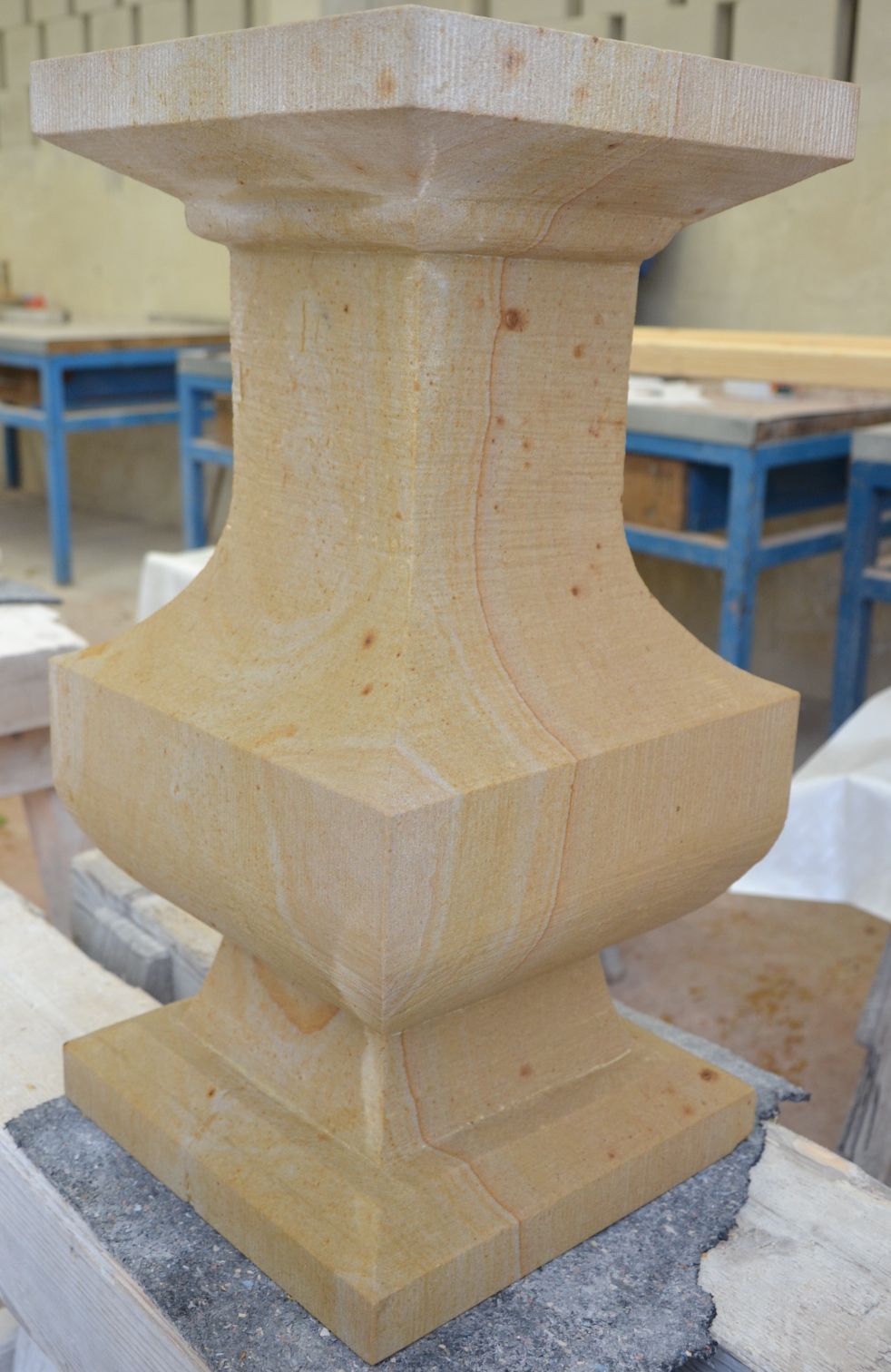 Werkstücke aus vorwiegend Sandstein und eine Arbeitsprobe mit Text und
